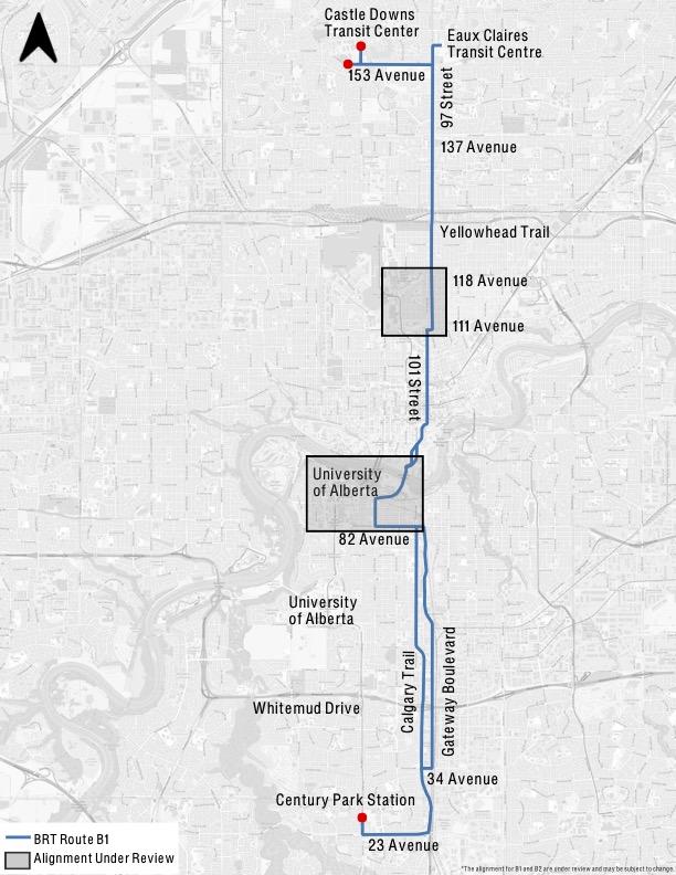 The B1 Route (left) runs north-south through central Edmonton, connecting Castle Downs and Century Park, mostly along 97th street, 101st street, Calgary Trail, and Gateway Boulevard. This route will connect major destinations like Eaux Claires, Northgate Mall, Chinatown, Downtown, Old Strathcona, and Calgary Trail, as well as two LRT stations and four transit centres. This route fills in a massive gap in transit service to the major commercial street of Calgary Trail, which currently is only served by a low-frequency circulator bus connecting into Southgate. North of the river, this route covers the Northside’s main connection to Downtown, with 23,000 trips between the Northside and central Edmonton daily.